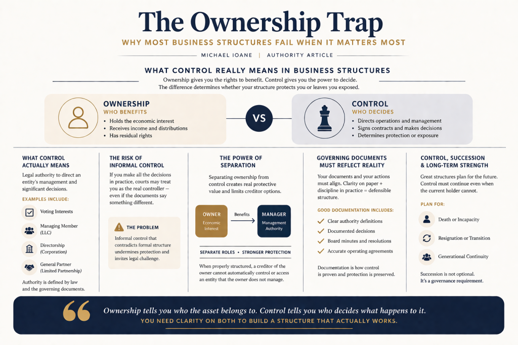 Michael Ioane treats control in business structures as one of the primary design variables in every structuring engagement. The question is not simply who owns the entity. The question is who holds authority over the entity, how that authority is defined, and whether the governing documents accurately reflect how authority is actually exercised.