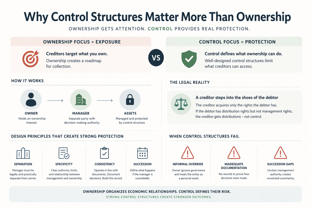 This is the protection that charging order statutes are designed to preserve in jurisdictions with strong charging order protection. The protection works because of how control is structured, not because of how ownership is held. Control structures and ownership risk are not independent variables. The way control is allocated determines how much risk is attached to the ownership interest, and therefore how exposed the owner is when a creditor obtains that interest.