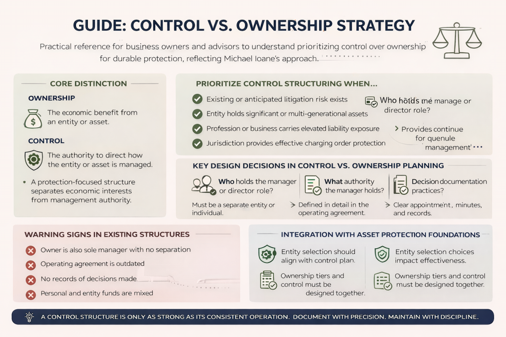 This guide provides a practical reference for business owners and advisors who want to understand the control vs. ownership strategy and how to apply it to structuring decisions. The frameworks here reflect Michael Ioane’s approach to designing structures that provide durable protection by separating economic interests from management authority.