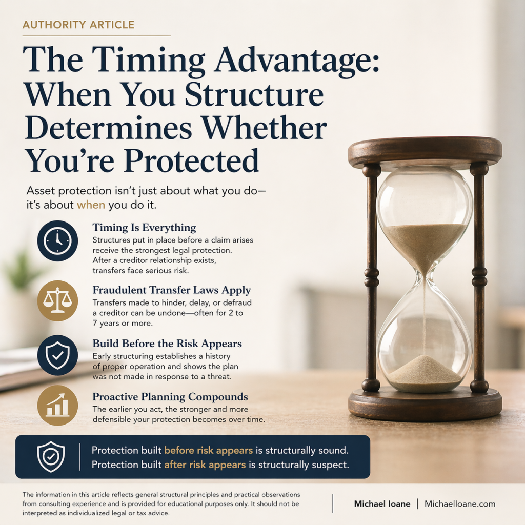 Asset protection timing is one of the most consequential variables in any protection strategy, and it is frequently underestimated until it is too late to address. The legal effectiveness of a protective structure is not determined solely by its design. It is also determined by when that structure was put in place relative to when a claim arose. A structure that would have been entirely effective if implemented two years earlier may provide little or no protection if implemented after a creditor relationship has already formed.