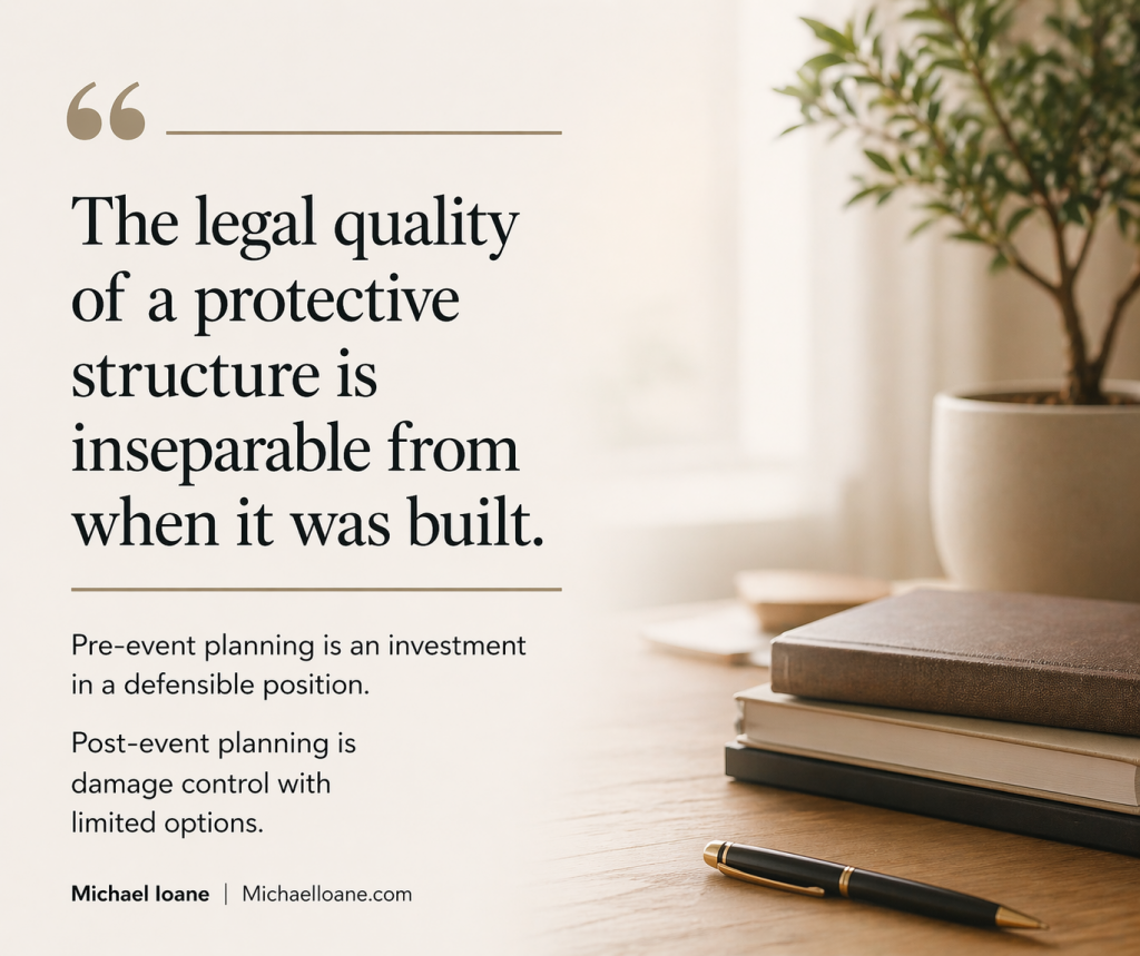 Michael Ioane addresses this distinction at the outset of every structuring engagement because it determines the parameters of what can be responsibly recommended and implemented. The analysis varies significantly depending on whether a client is planning for a known risk or addressing one that has already materialized.